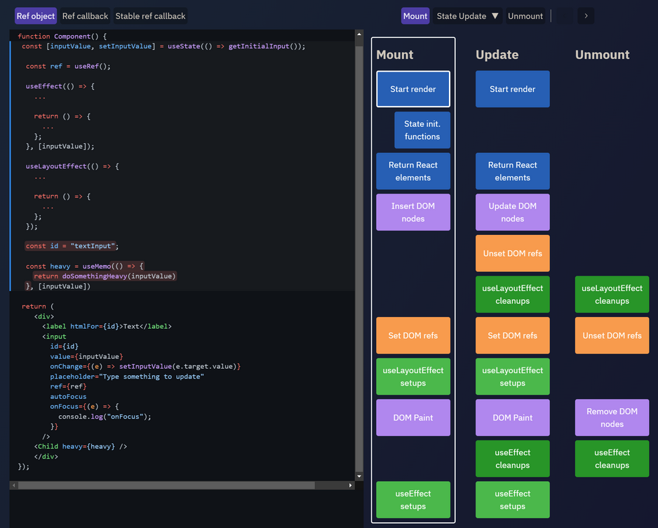 After React has updated the DOM in the commit phase, it updates all refs accordingly to point to the requested DOM nodes and component instances. It then synchronously runs the componentDidMount and componentDidUpdate class lifecycle methods, and the useLayoutEffect hooks.