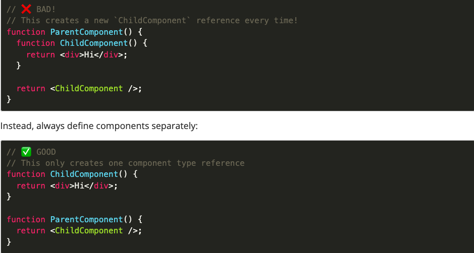 This means that you must never create new component types while rendering! Whenever you create a new component type, it’s a different reference, and that will cause React to repeatedly destroy and recreate the child component tree.