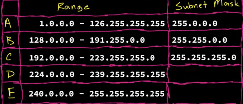 Class A for example since it has so many networks based on a single address is usually given to really big companies with very big networks like IBM or ATT Classes D and E are not accessible and the 127.0.0.0(which is a class A IP address is the reserved local address-this inludes all addresses in its 255.0.0.0 mask as well-)